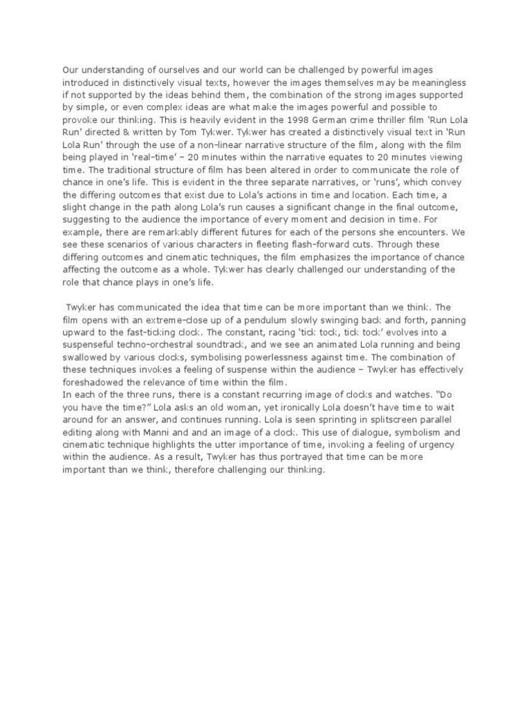 This idea of going with the flow and letting life take its course, shows how it can be the best decision to not make one at all. The previous times that Lola tried to control what happened in her life, the story took a turn for the worst. When she chose a way to benefit The use of a variety of techniques create distinctively visual images that are both memorable and unique, run lola run essay, they feature visuals that are highly distinctive.